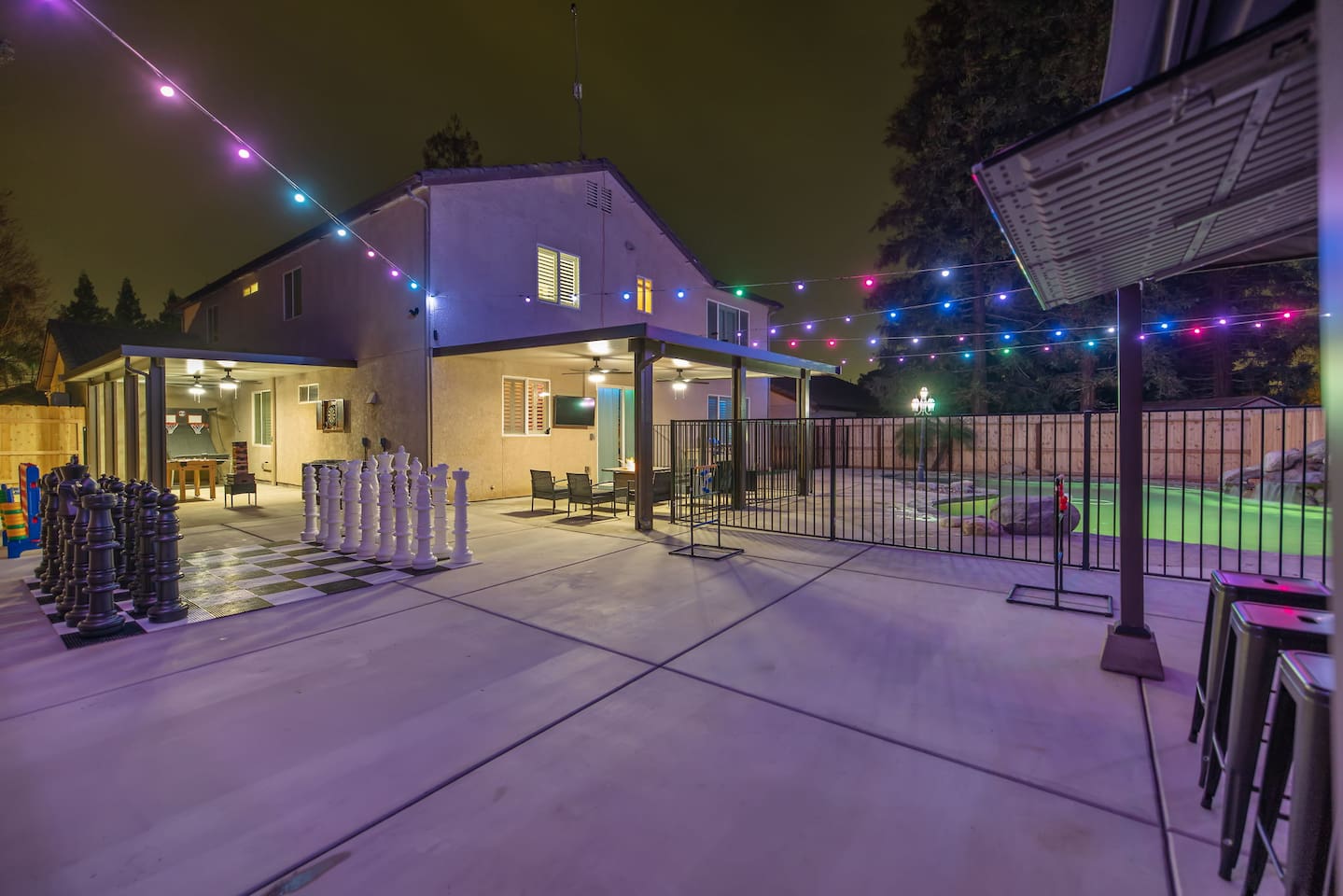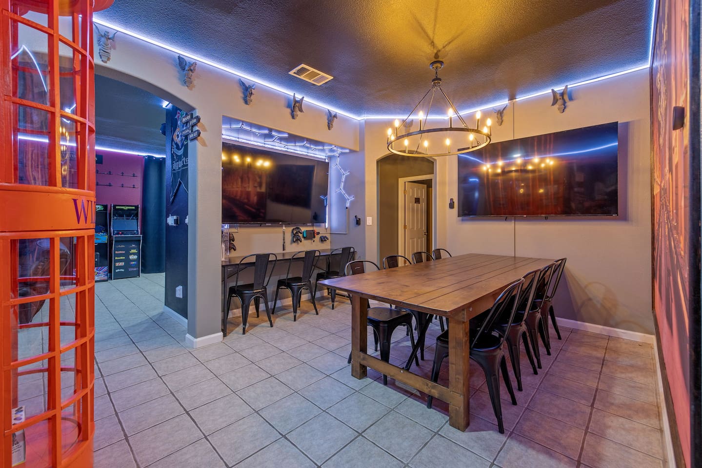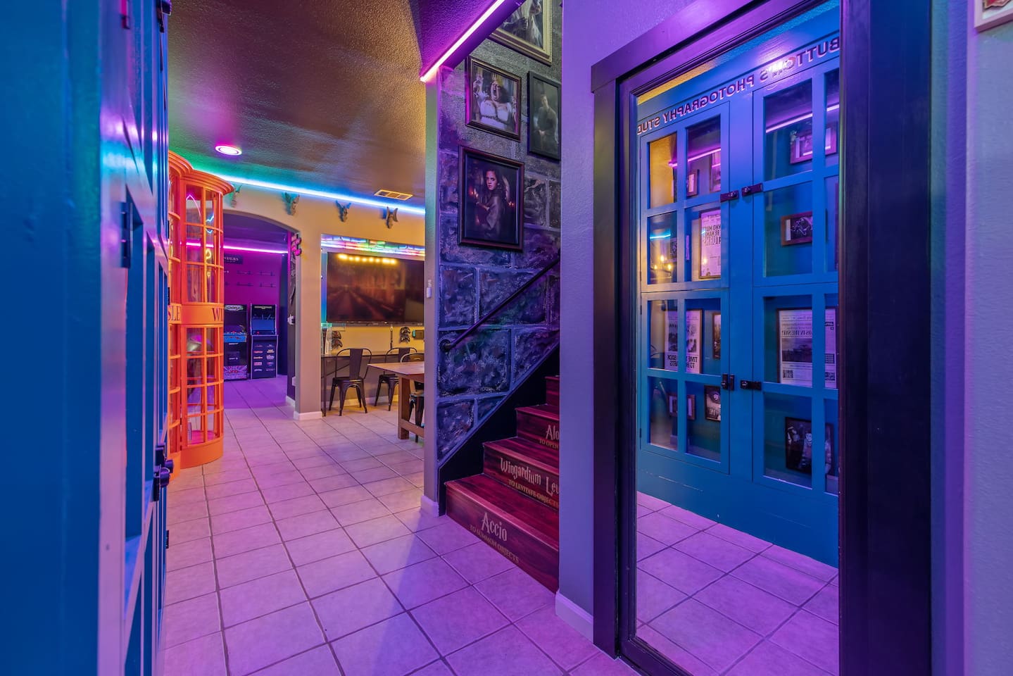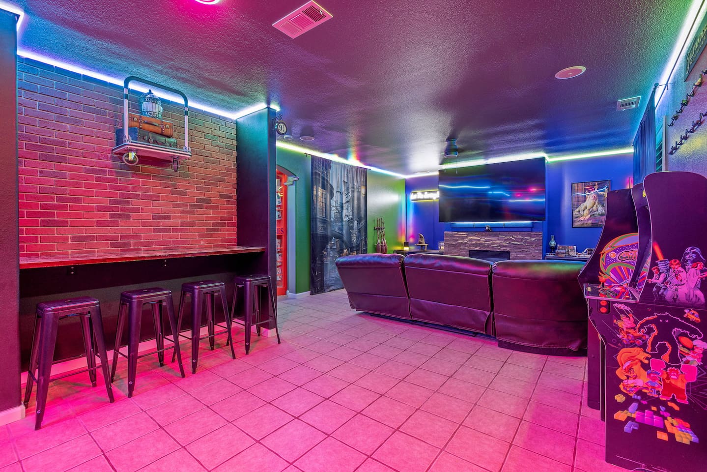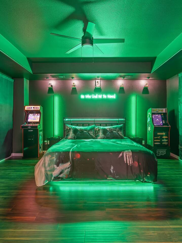 As you step through the front door, you're welcomed by a full-size arcade surrounded by two wall-to-wall fantasy-themed murals. Fully customizable color-changing lighting lines the entire first floor, creating an immersive atmosphere from the moment you arrive. Continue down the hallway into a charming old-world marketplace setting featuring two full-scale themed storefront façades — a whimsical novelty shop and a vintage-style magical studio — designed to transport you into a world of imagination. The dining area has been transformed into a grand medieval-inspired banquet space, complete with two 75” TVs, a PS5, and a Nintendo Switch — perfect for gaming nights and group entertainment. The living room features a MASSIVE 98” TV, interactive fantasy décor elements, a themed study display, and several "photo-op" moments! As you head upstairs, you’ll pass through a gallery-style hallway lined with portrait art, leading into a darker, mystery-inspired corridor featuring a full-size antique magic shop façade. For added fun, there’s even a playful themed “fantasy jail” photo area. Each bedroom embraces a different fantasy-inspired theme. The master suite features a king-size bed and a dramatic dark fantasy aesthetic, including mystical décor elements, serpent-inspired accents, and a fantasy inspired spa bathroom. Step outside onto the private balcony and relax in comfortable seating after a long day exploring nearby mountain trails and natural attractions. The outdoor space continues the experience with: • Large pebble-finish pool • 7-person hot tub • Mini golf • Giant chess • Giant Jenga • Basketball • Foosball • Bar shed with TV & mini fridge ....& Much, Much More! Treat your group to a one-of-a-kind immersive fantasy stay near Sequoia National Park. *This property includes an attached ADU (Accessory Dwelling Unit) that is rented separately. Both units are kept completely separate with no shared spaces*