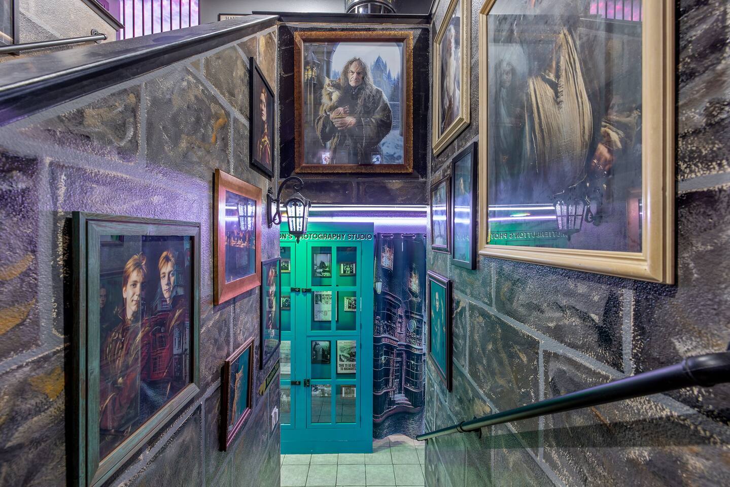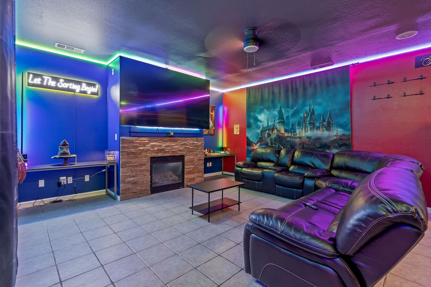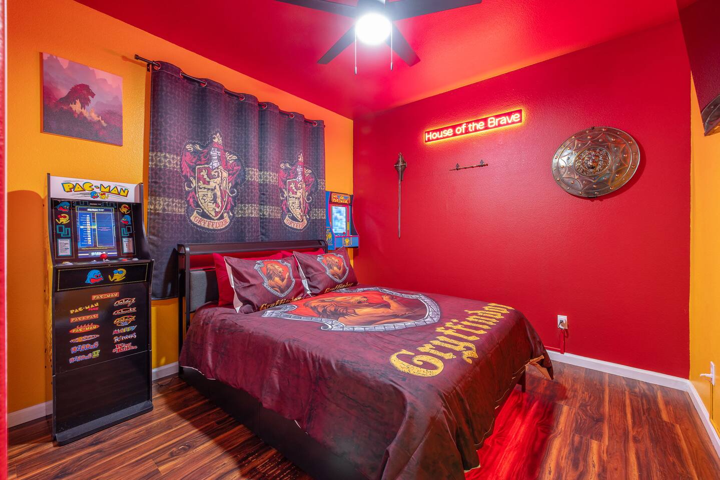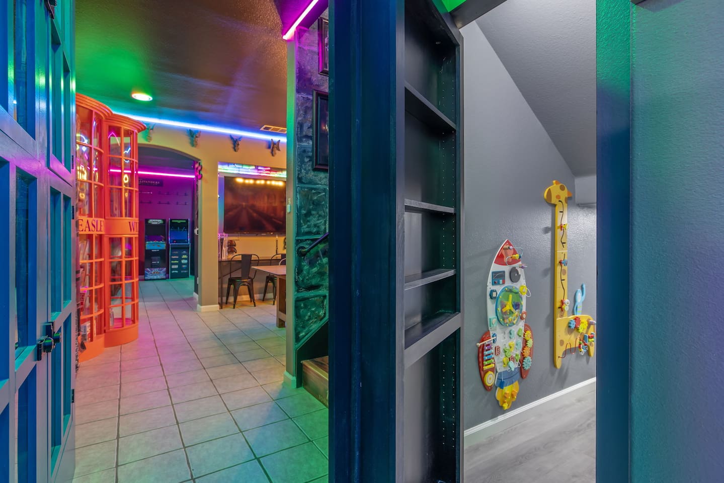 As you step through the front door, you're welcomed by a full-size arcade surrounded by two wall-to-wall fantasy-themed murals. Fully customizable color-changing lighting lines the entire first floor, creating an immersive atmosphere from the moment you arrive. Continue down the hallway into a charming old-world marketplace setting featuring two full-scale themed storefront façades — a whimsical novelty shop and a vintage-style magical studio — designed to transport you into a world of imagination. The dining area has been transformed into a grand medieval-inspired banquet space, complete with two 75” TVs, a PS5, and a Nintendo Switch — perfect for gaming nights and group entertainment. The living room features a MASSIVE 98” TV, interactive fantasy décor elements, a themed study display, and several "photo-op" moments! As you head upstairs, you’ll pass through a gallery-style hallway lined with portrait art, leading into a darker, mystery-inspired corridor featuring a full-size antique magic shop façade. For added fun, there’s even a playful themed “fantasy jail” photo area. Each bedroom embraces a different fantasy-inspired theme. The master suite features a king-size bed and a dramatic dark fantasy aesthetic, including mystical décor elements, serpent-inspired accents, and a fantasy inspired spa bathroom. Step outside onto the private balcony and relax in comfortable seating after a long day exploring nearby mountain trails and natural attractions. The outdoor space continues the experience with: • Large pebble-finish pool • 7-person hot tub • Mini golf • Giant chess • Giant Jenga • Basketball • Foosball • Bar shed with TV & mini fridge ....& Much, Much More! Treat your group to a one-of-a-kind immersive fantasy stay near Sequoia National Park. *This property includes an attached ADU (Accessory Dwelling Unit) that is rented separately. Both units are kept completely separate with no shared spaces*