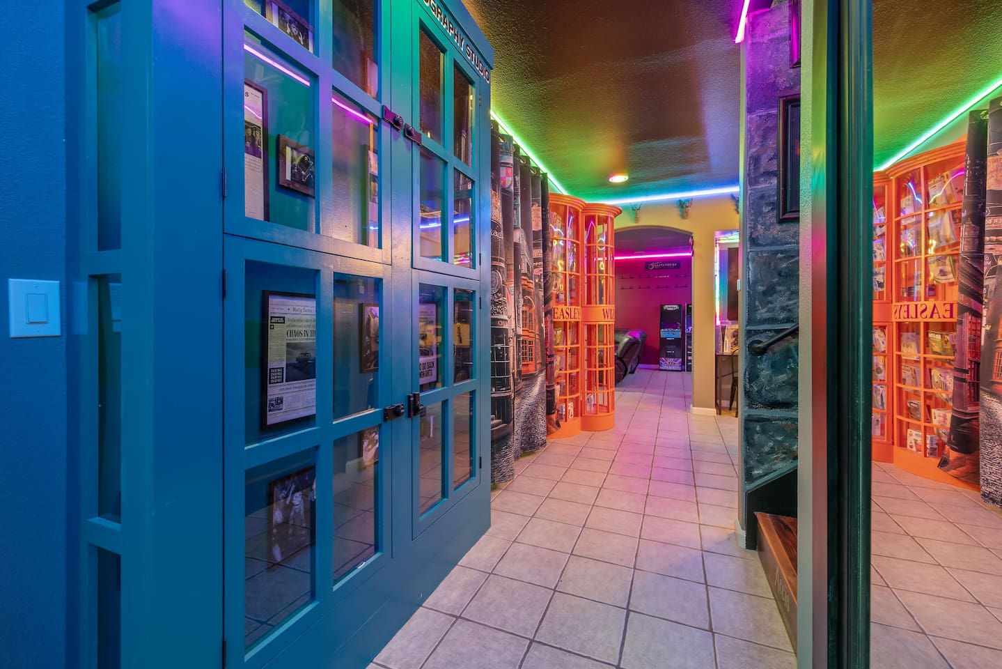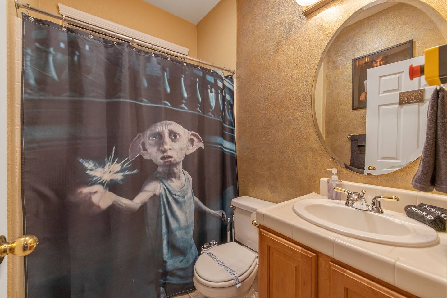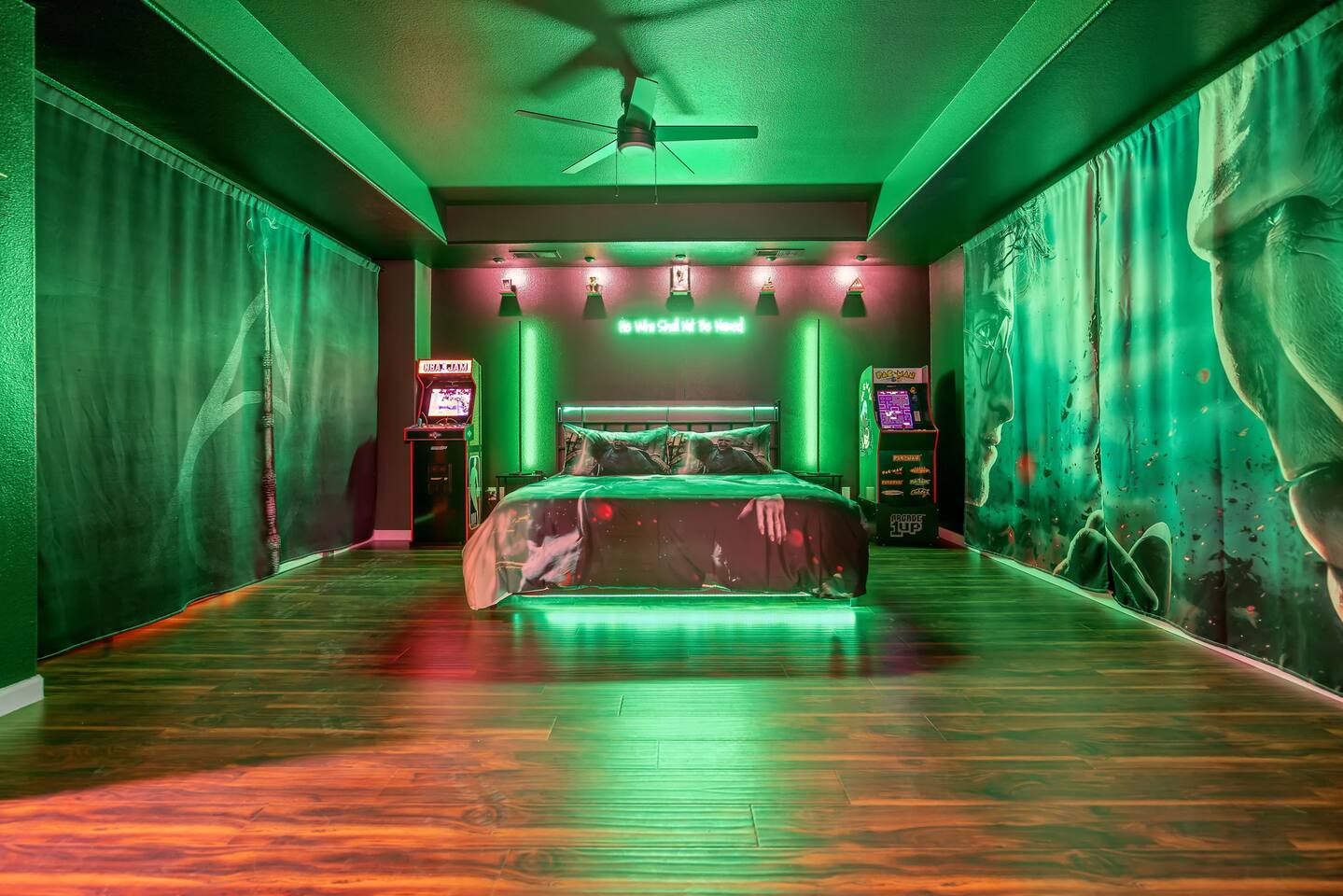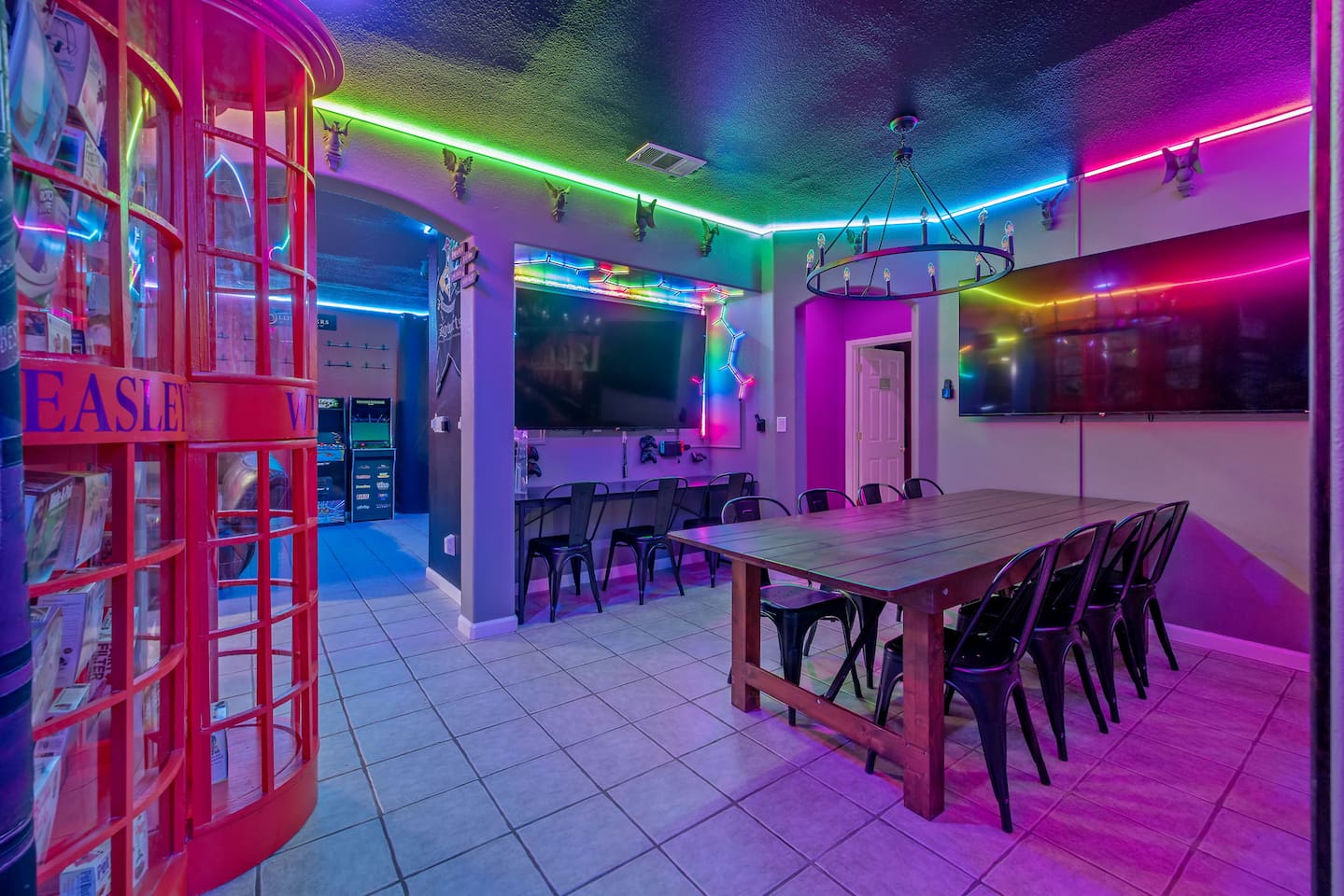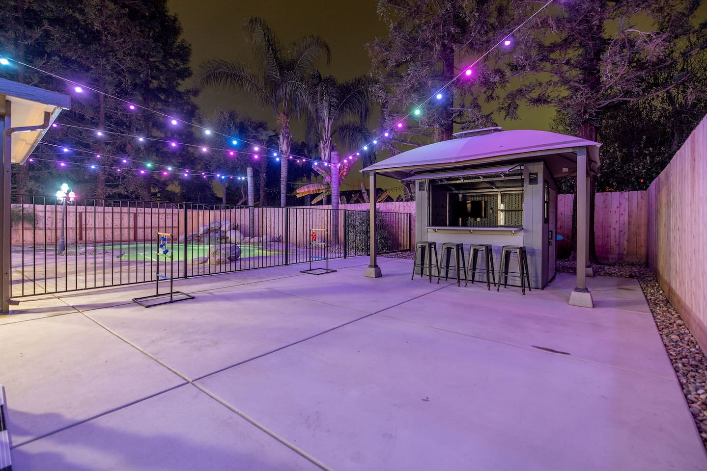 As you step through the front door, you're welcomed by a full-size arcade surrounded by two wall-to-wall fantasy-themed murals. Fully customizable color-changing lighting lines the entire first floor, creating an immersive atmosphere from the moment you arrive. Continue down the hallway into a charming old-world marketplace setting featuring two full-scale themed storefront façades — a whimsical novelty shop and a vintage-style magical studio — designed to transport you into a world of imagination. The dining area has been transformed into a grand medieval-inspired banquet space, complete with two 75” TVs, a PS5, and a Nintendo Switch — perfect for gaming nights and group entertainment. The living room features a MASSIVE 98” TV, interactive fantasy décor elements, a themed study display, and several "photo-op" moments! As you head upstairs, you’ll pass through a gallery-style hallway lined with portrait art, leading into a darker, mystery-inspired corridor featuring a full-size antique magic shop façade. For added fun, there’s even a playful themed “fantasy jail” photo area. Each bedroom embraces a different fantasy-inspired theme. The master suite features a king-size bed and a dramatic dark fantasy aesthetic, including mystical décor elements, serpent-inspired accents, and a fantasy inspired spa bathroom. Step outside onto the private balcony and relax in comfortable seating after a long day exploring nearby mountain trails and natural attractions. The outdoor space continues the experience with: • Large pebble-finish pool • 7-person hot tub • Mini golf • Giant chess • Giant Jenga • Basketball • Foosball • Bar shed with TV & mini fridge ....& Much, Much More! Treat your group to a one-of-a-kind immersive fantasy stay near Sequoia National Park. *This property includes an attached ADU (Accessory Dwelling Unit) that is rented separately. Both units are kept completely separate with no shared spaces*