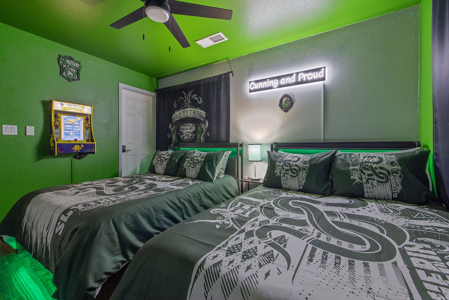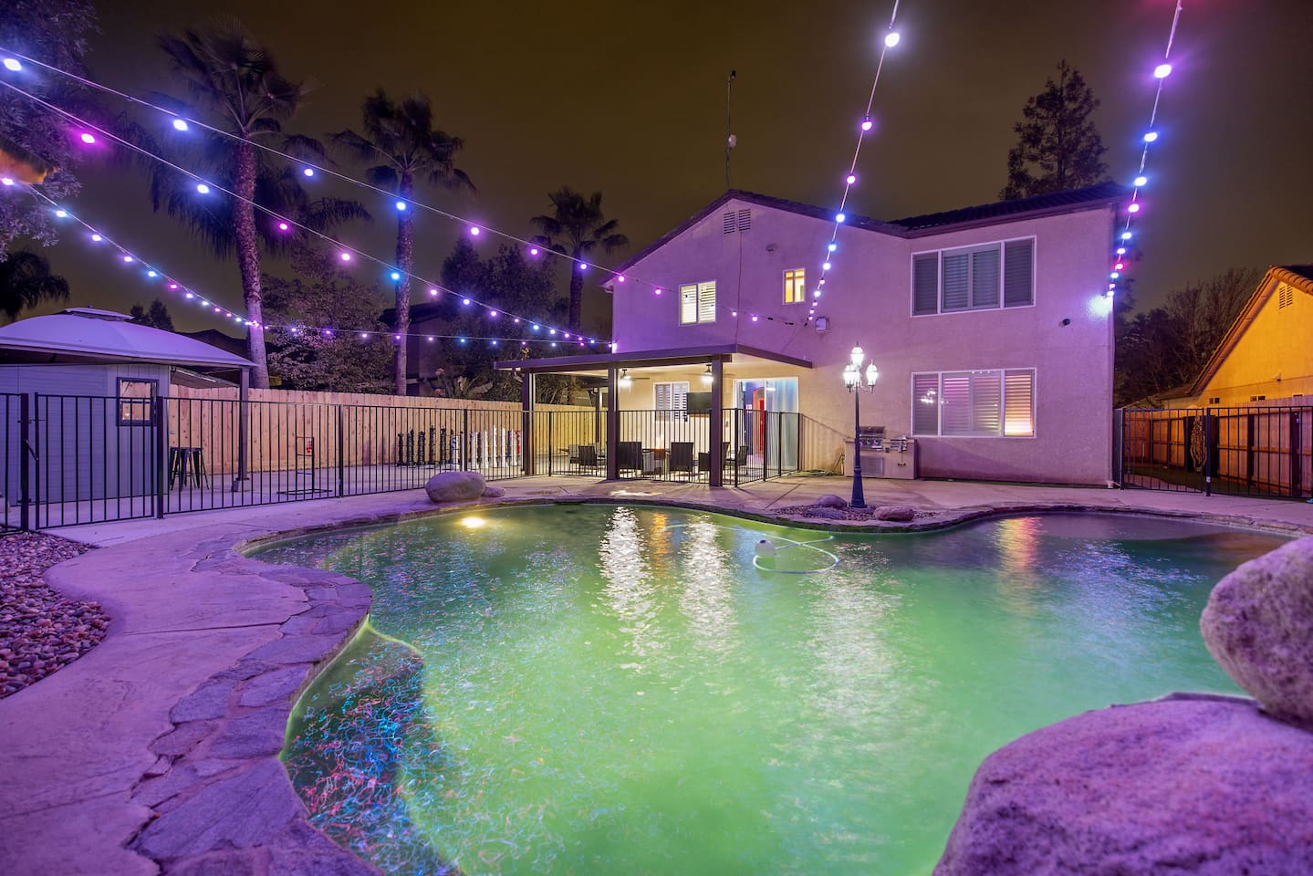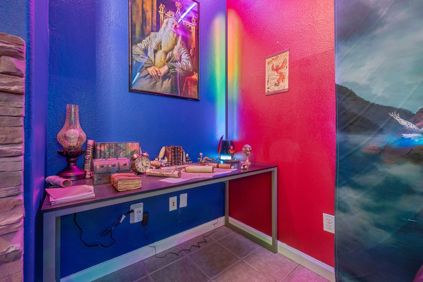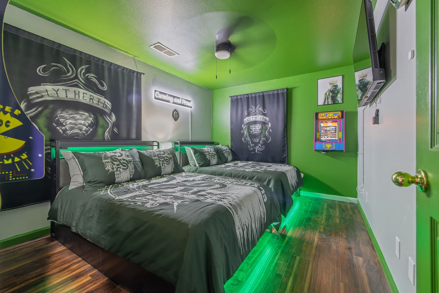 As you step through the front door, you're welcomed by a full-size arcade surrounded by two wall-to-wall fantasy-themed murals. Fully customizable color-changing lighting lines the entire first floor, creating an immersive atmosphere from the moment you arrive. Continue down the hallway into a charming old-world marketplace setting featuring two full-scale themed storefront façades — a whimsical novelty shop and a vintage-style magical studio — designed to transport you into a world of imagination. The dining area has been transformed into a grand medieval-inspired banquet space, complete with two 75” TVs, a PS5, and a Nintendo Switch — perfect for gaming nights and group entertainment. The living room features a MASSIVE 98” TV, interactive fantasy décor elements, a themed study display, and several "photo-op" moments! As you head upstairs, you’ll pass through a gallery-style hallway lined with portrait art, leading into a darker, mystery-inspired corridor featuring a full-size antique magic shop façade. For added fun, there’s even a playful themed “fantasy jail” photo area. Each bedroom embraces a different fantasy-inspired theme. The master suite features a king-size bed and a dramatic dark fantasy aesthetic, including mystical décor elements, serpent-inspired accents, and a fantasy inspired spa bathroom. Step outside onto the private balcony and relax in comfortable seating after a long day exploring nearby mountain trails and natural attractions. The outdoor space continues the experience with: • Large pebble-finish pool • 7-person hot tub • Mini golf • Giant chess • Giant Jenga • Basketball • Foosball • Bar shed with TV & mini fridge ....& Much, Much More! Treat your group to a one-of-a-kind immersive fantasy stay near Sequoia National Park. *This property includes an attached ADU (Accessory Dwelling Unit) that is rented separately. Both units are kept completely separate with no shared spaces*