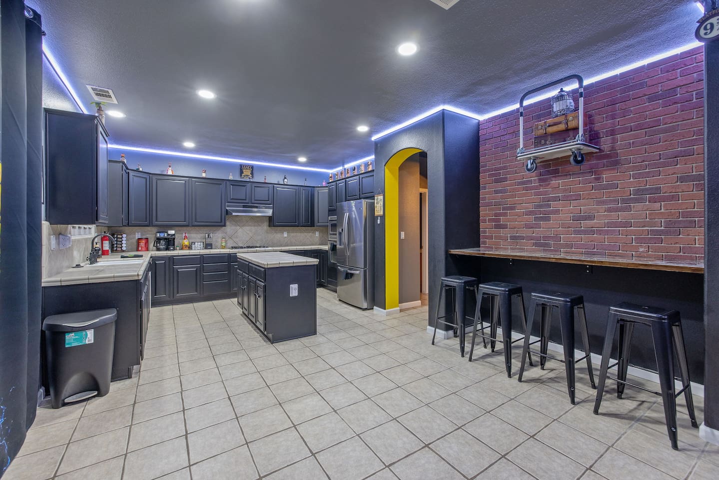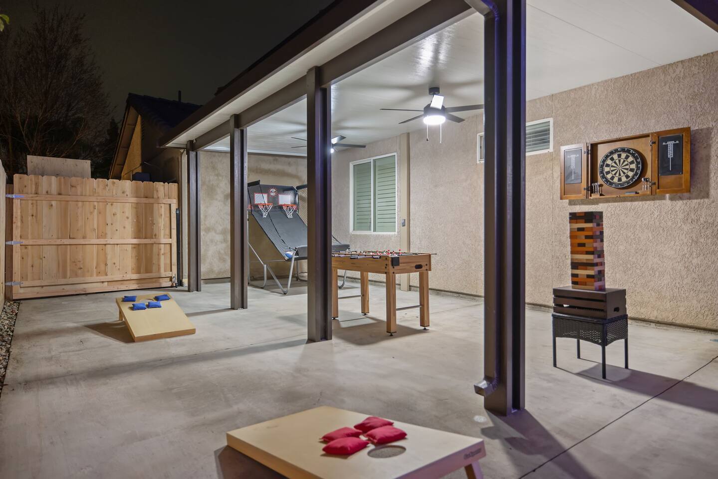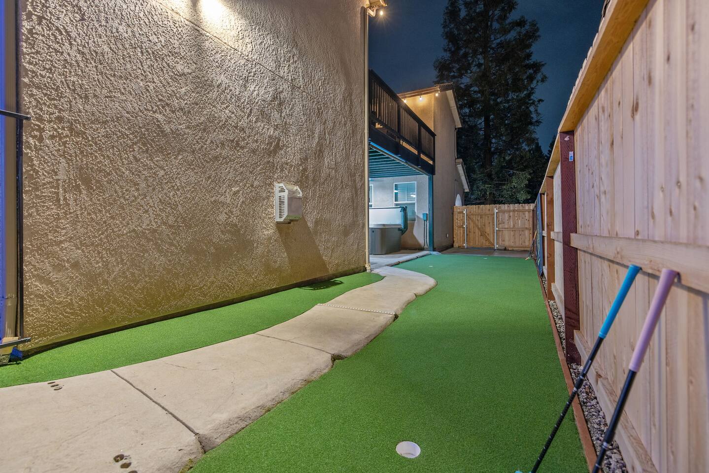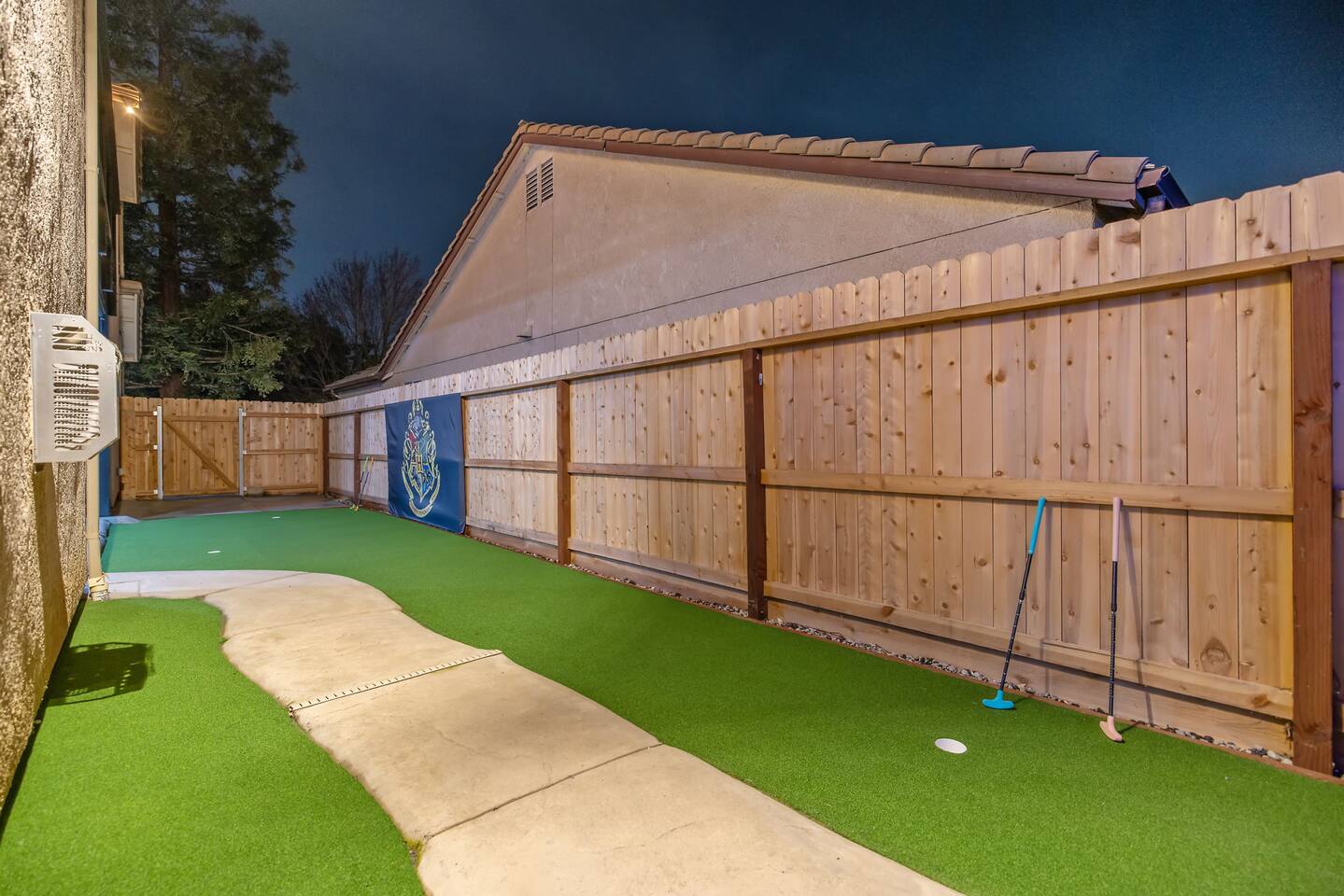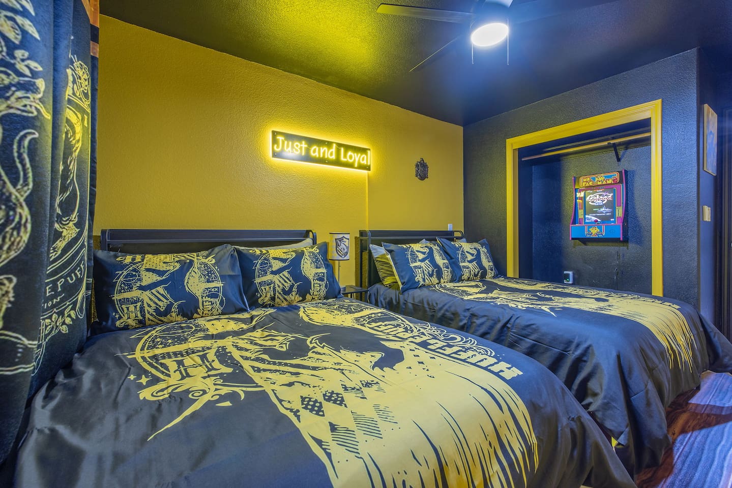 As you step through the front door, you're welcomed by a full-size arcade surrounded by two wall-to-wall fantasy-themed murals. Fully customizable color-changing lighting lines the entire first floor, creating an immersive atmosphere from the moment you arrive. Continue down the hallway into a charming old-world marketplace setting featuring two full-scale themed storefront façades — a whimsical novelty shop and a vintage-style magical studio — designed to transport you into a world of imagination. The dining area has been transformed into a grand medieval-inspired banquet space, complete with two 75” TVs, a PS5, and a Nintendo Switch — perfect for gaming nights and group entertainment. The living room features a MASSIVE 98” TV, interactive fantasy décor elements, a themed study display, and several "photo-op" moments! As you head upstairs, you’ll pass through a gallery-style hallway lined with portrait art, leading into a darker, mystery-inspired corridor featuring a full-size antique magic shop façade. For added fun, there’s even a playful themed “fantasy jail” photo area. Each bedroom embraces a different fantasy-inspired theme. The master suite features a king-size bed and a dramatic dark fantasy aesthetic, including mystical décor elements, serpent-inspired accents, and a fantasy inspired spa bathroom. Step outside onto the private balcony and relax in comfortable seating after a long day exploring nearby mountain trails and natural attractions. The outdoor space continues the experience with: • Large pebble-finish pool • 7-person hot tub • Mini golf • Giant chess • Giant Jenga • Basketball • Foosball • Bar shed with TV & mini fridge ....& Much, Much More! Treat your group to a one-of-a-kind immersive fantasy stay near Sequoia National Park. *This property includes an attached ADU (Accessory Dwelling Unit) that is rented separately. Both units are kept completely separate with no shared spaces*