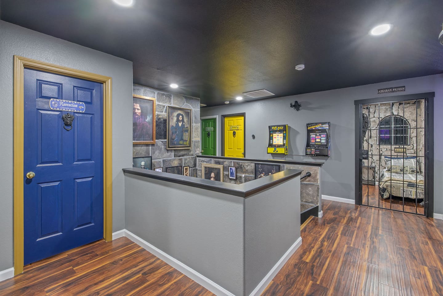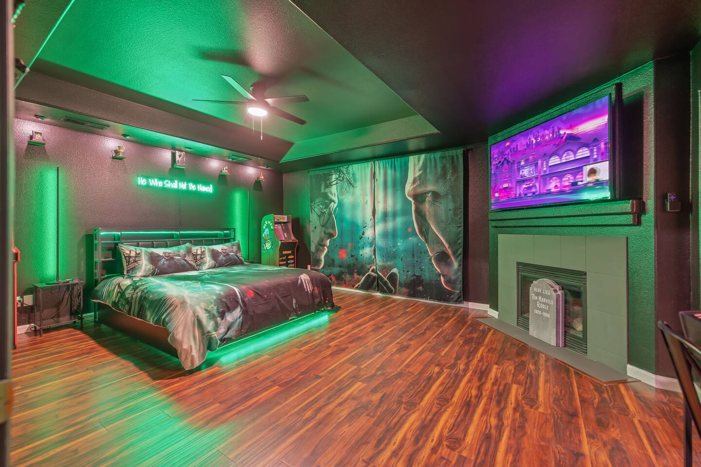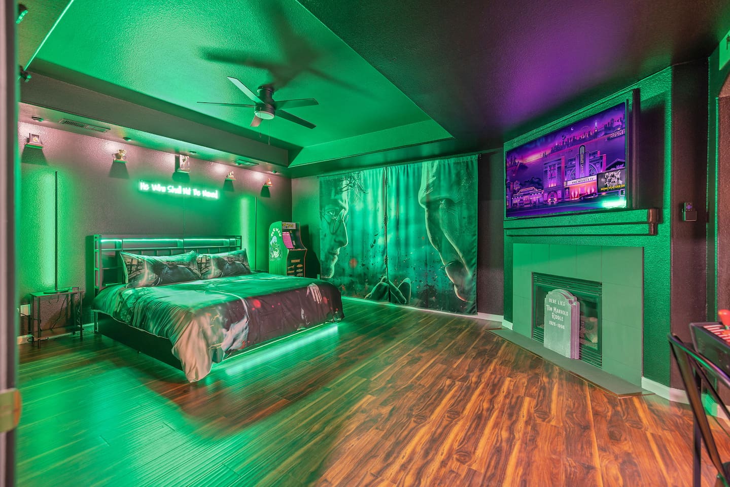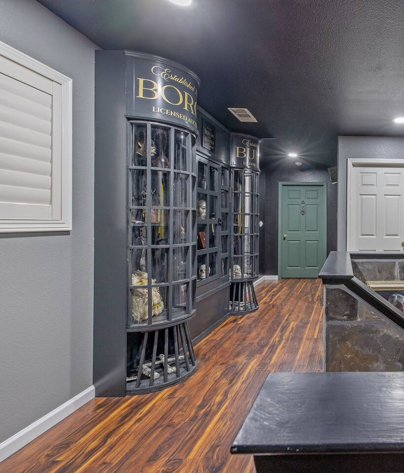 *Venue Rental Available Upon Request* Welcome to Visalia’s ICONIC immersive Wizard Themed Home, just 40 minutes from Sequoia National Park. Enjoy a full-size arcade, grand banquet-style dining room, portrait gallery hallway, vintage marketplace inspired corridor, dramatically sinister master suite with private balcony, plus a pool, 7-person hot tub, mini golf, giant chess, and more. A one-of-a-kind whimsical stay your group will never forget.
