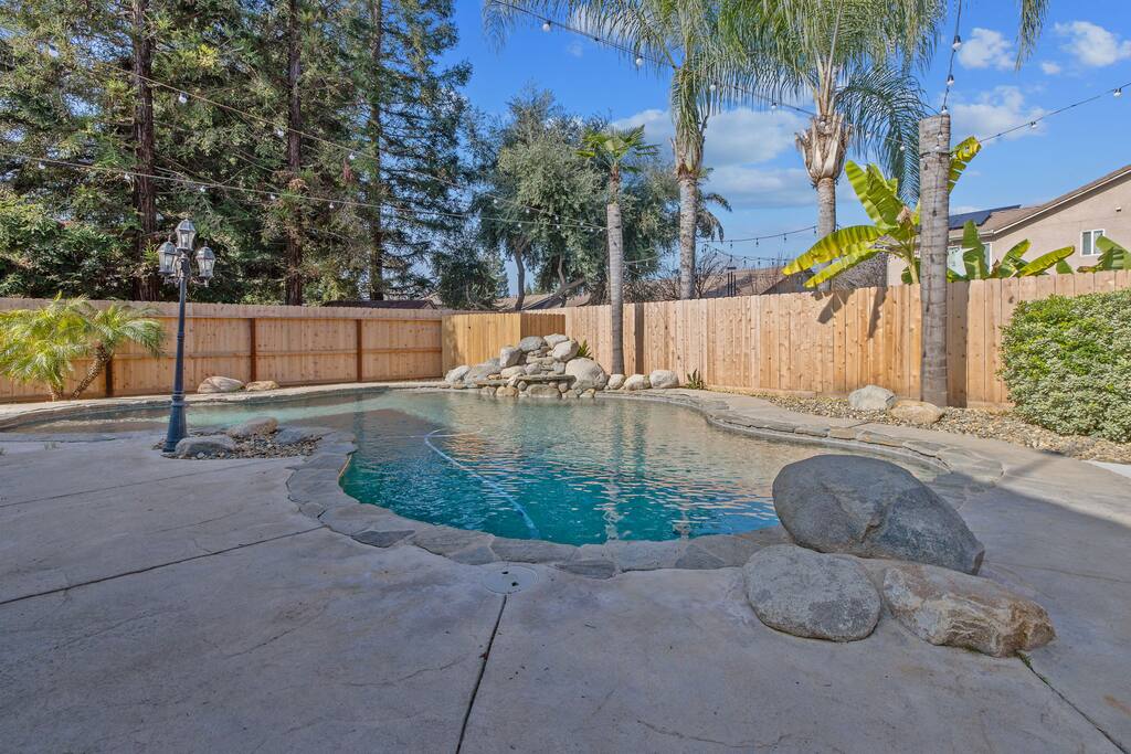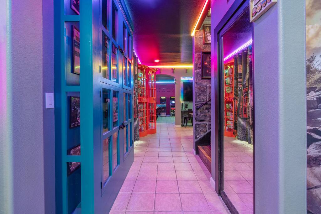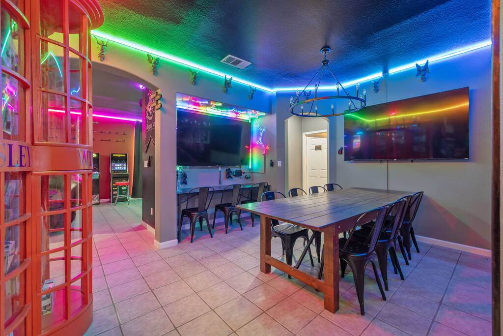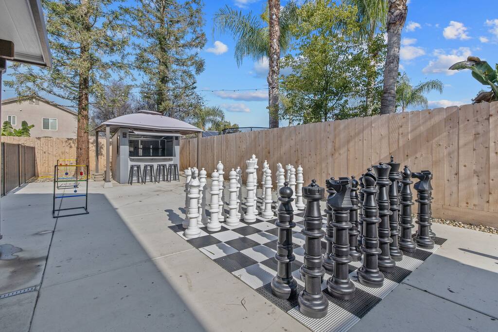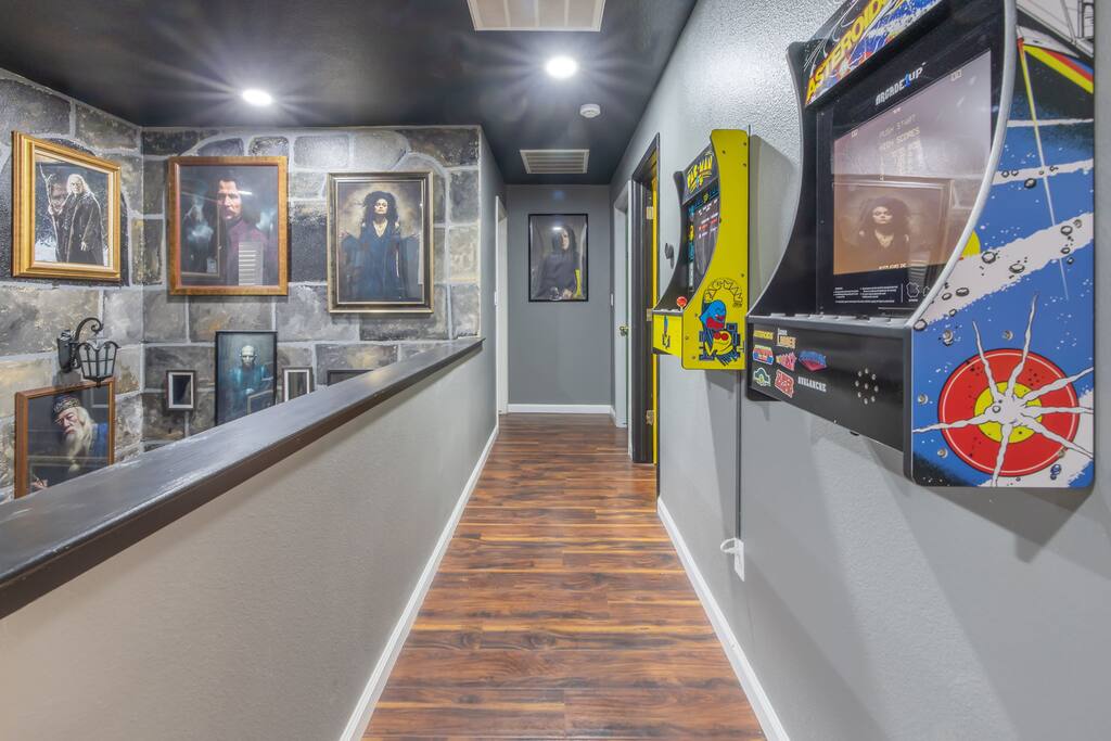 As you enter the front door you are met with a full size arcade featuring TWO wall-to-wall Harry Potter themed murals with fully customizable color changing lights lining the entire perimeter of the first floor. As you journey through the hallway, no floo powder is needed as you enter the magical world of Diagon Alley, featuring two full-size buildings: Shutterbutton's Photography Studio and Weasleys' Wizard Weezes. The dining room has been transformed into none other than the Great Hall, with not one but two 75" TV's a PS5 and Nintendo Switch to curb any true gamer's appetite. The living room features a MASSIVE 98" TV, a Sorting Hat to decide who belongs in which house, a replica of Dumbledore's desk and 9 3/4 Station. As you make your way up the stairway, you are teleported into the Hall Of Portraits, leading you straight into Knockturn Alley with a full size Borgin & Burkes building. If a wizard has been misbehaving, you can lock them up in your very own Azkaban Prison! Take a journey through Hogwarts as the bedrooms have been thoughtfully transformed into the four houses: Gryffindor, Hufflepuff, Slytherin & Ravenclaw. Be weary of where you wander as you may find yourself in the middle of Voldemort's Lair, the master bedroom. Featuring a King size bed, Horcruxes, Nagini and a Chamber Of Secrets themed master bath. The master bedroom also has private balcony access with an array of seating to relax after long day of hiking at the sequoias. The outdoor space of this home is just as magical as the indoor space, featuring a large pebble tec pool, 7 person hot tub, mini golf, giant chess, giant jenga, basketball, foosball and bar shed, fully stocked with a TV & mini fridge! Don't pass up this incredible home and treat your group to a once in a lifetime stay at our beautiful magical retreat near Sequoia National Park!