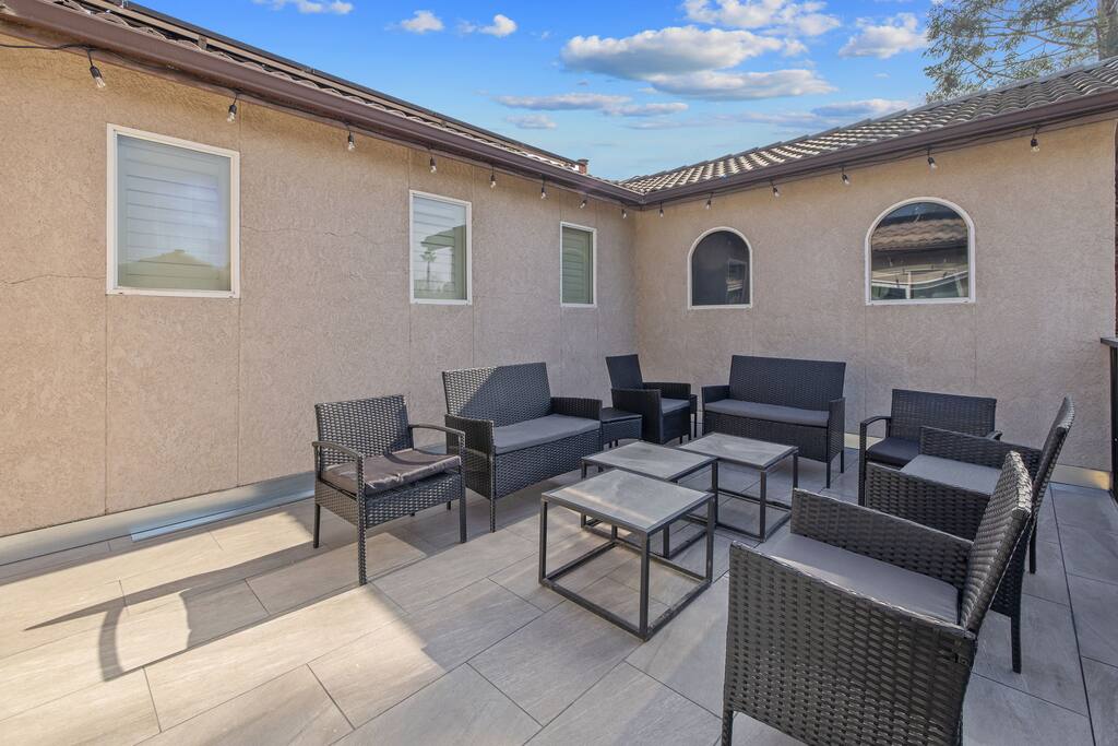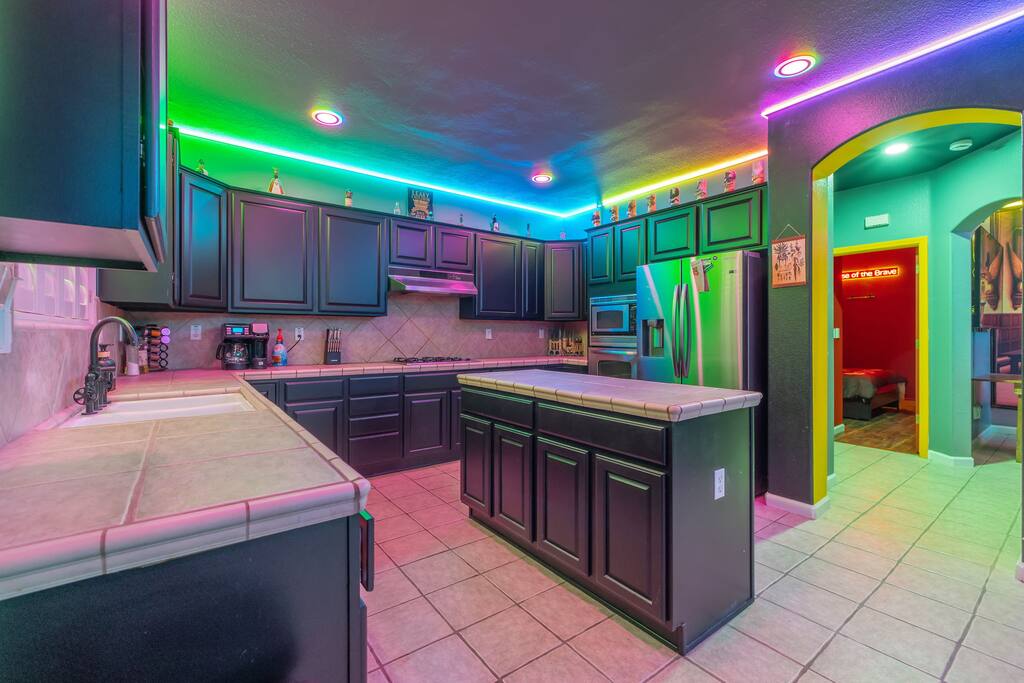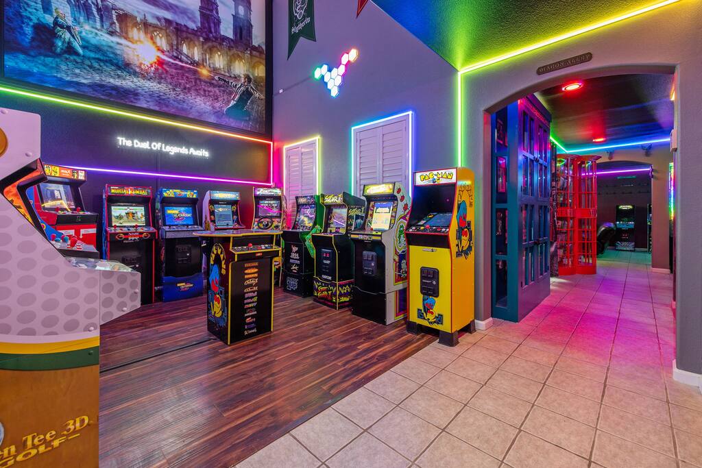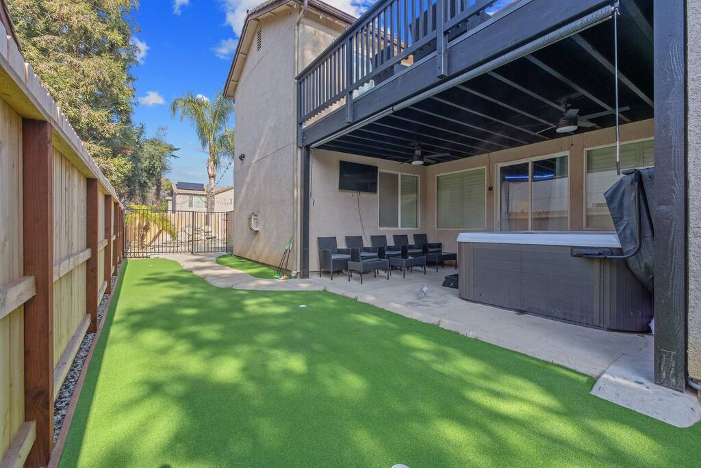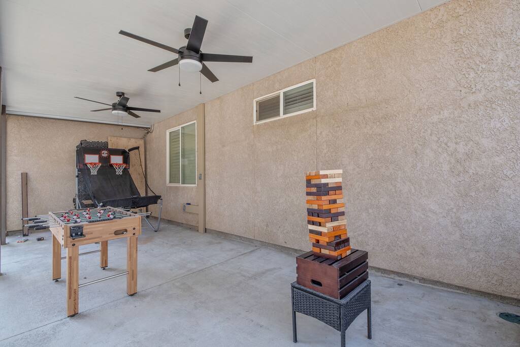 As you enter the front door you are met with a full size arcade featuring TWO wall-to-wall Harry Potter themed murals with fully customizable color changing lights lining the entire perimeter of the first floor. As you journey through the hallway, no floo powder is needed as you enter the magical world of Diagon Alley, featuring two full-size buildings: Shutterbutton's Photography Studio and Weasleys' Wizard Weezes. The dining room has been transformed into none other than the Great Hall, with not one but two 75" TV's a PS5 and Nintendo Switch to curb any true gamer's appetite. The living room features a MASSIVE 98" TV, a Sorting Hat to decide who belongs in which house, a replica of Dumbledore's desk and 9 3/4 Station. As you make your way up the stairway, you are teleported into the Hall Of Portraits, leading you straight into Knockturn Alley with a full size Borgin & Burkes building. If a wizard has been misbehaving, you can lock them up in your very own Azkaban Prison! Take a journey through Hogwarts as the bedrooms have been thoughtfully transformed into the four houses: Gryffindor, Hufflepuff, Slytherin & Ravenclaw. Be weary of where you wander as you may find yourself in the middle of Voldemort's Lair, the master bedroom. Featuring a King size bed, Horcruxes, Nagini and a Chamber Of Secrets themed master bath. The master bedroom also has private balcony access with an array of seating to relax after long day of hiking at the sequoias. The outdoor space of this home is just as magical as the indoor space, featuring a large pebble tec pool, 7 person hot tub, mini golf, giant chess, giant jenga, basketball, foosball and bar shed, fully stocked with a TV & mini fridge! Don't pass up this incredible home and treat your group to a once in a lifetime stay at our beautiful magical retreat near Sequoia National Park!