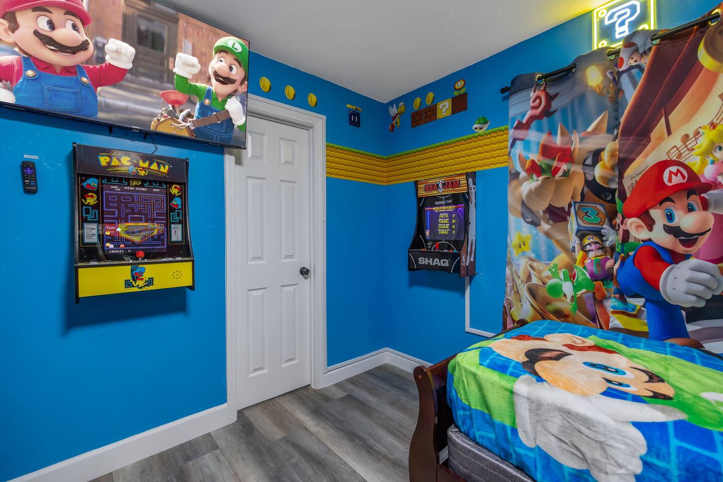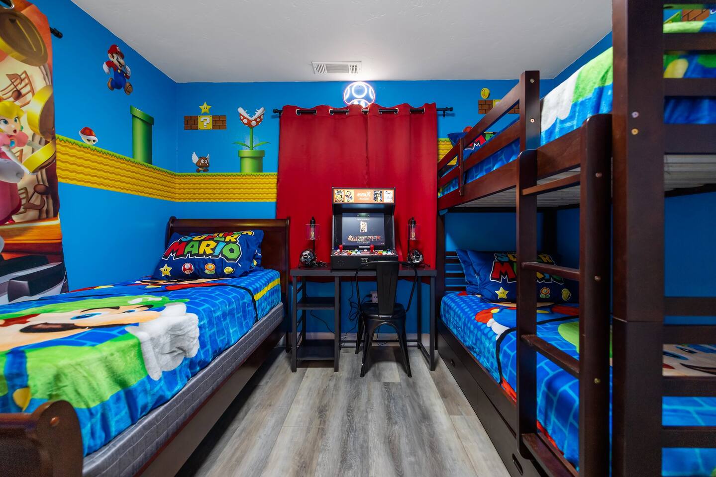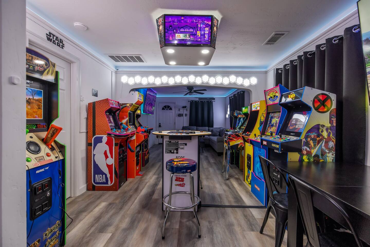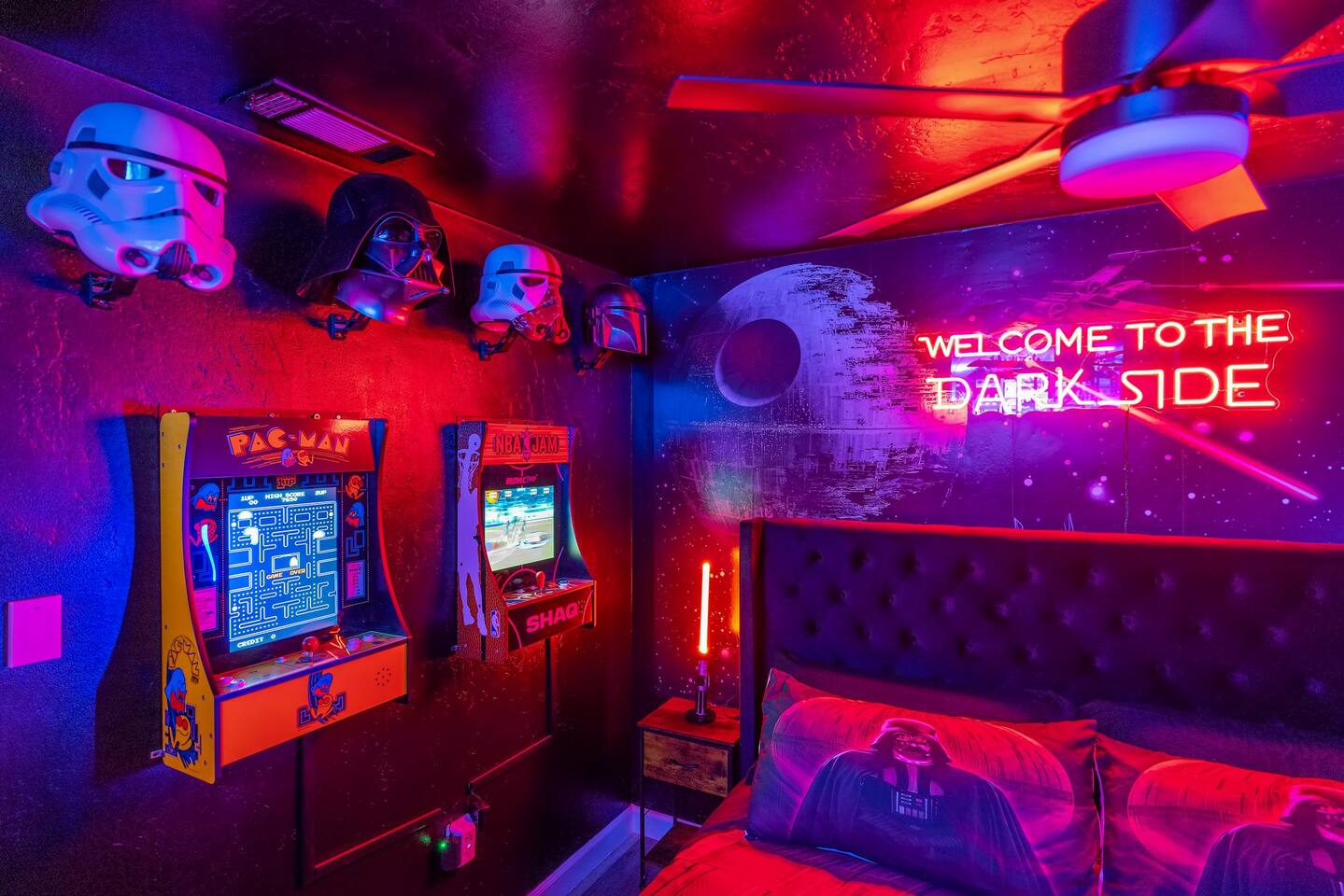 *Venue Rental Available Upon Request* Step into a gamer's paradise at Visalia's ICONIC Arcade Themed Home, just 40 minutes from Sequoia National Park and a block away from both Downtown Visalia & Rawhide Stadium! From a full size arcade in the living room, gaming lounge in the basement, Star Wars/Super Mario Themed bedrooms and an assortment of games throughout the entire home, as well as the back yard...this unique home will ensure an action packed trip you and your family will never forget.