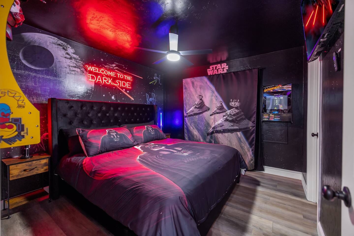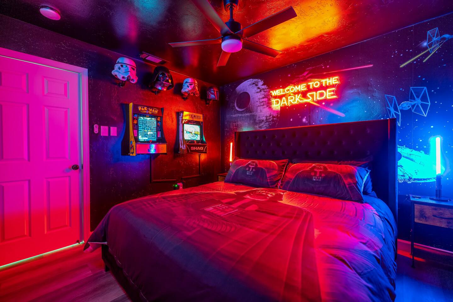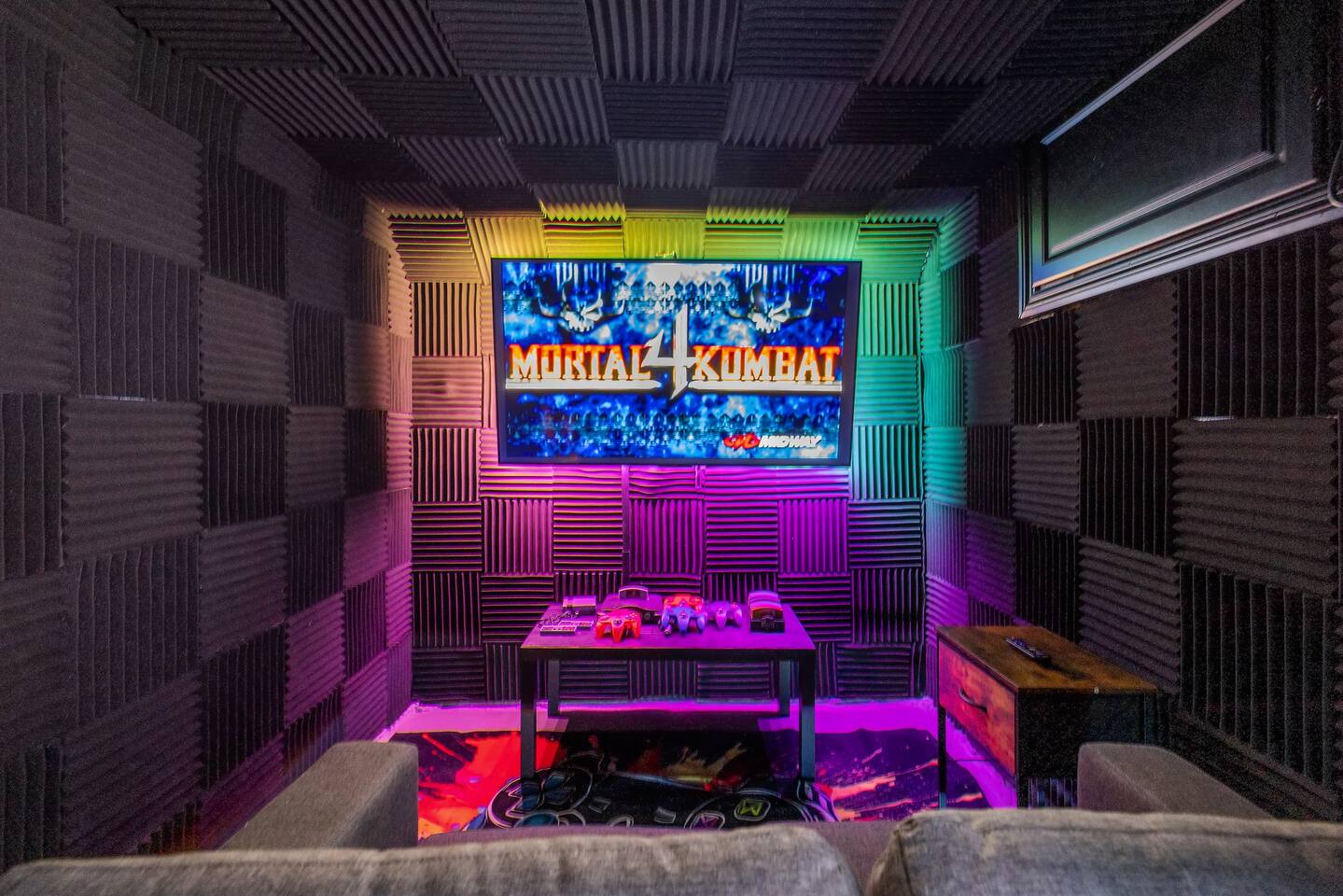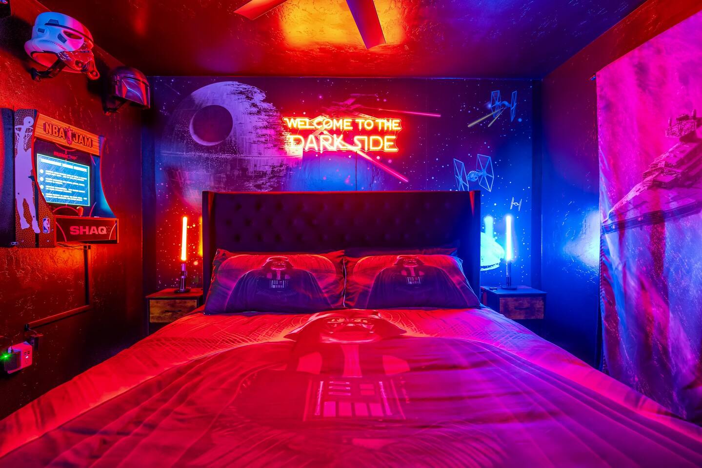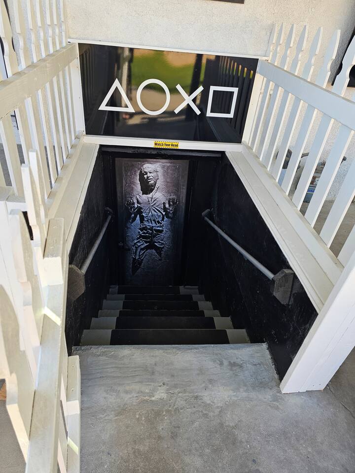 As you enter the front door you are met with a full arcade, a Quad-Screen Jumbotron & customizable color changing lights on every square inch of the living/dining room! The living room features a 75" TV, 6-Seater sectional and a 120" projector w/ pull down screen, turning your living room into a full fledged home theater! The dining room features yet another 75" TV and a Nintendo Switch w/ 4 controllers that is pre-loaded with Super Smash Bros Ultimate & Mario-Cart for endless fun! The modern kitchen is fully stocked with everything you need including pots, pans, spices, coffee, creamer, sugar, etc. The Star Wars Imperial themed master bedroom features an ultra comfortable King size bed, 3 arcade games (Pacman, NBA Jam, Asteroids), themed curtains, a death star mural, Imperial helmets, 50" TV and the unbridled force of the sith. The Super Mario themed kids bedroom features 3 twin size beds, 3 arcade games (Pacman, NBA Jam, NEO GEO), a Super Mario landscape across the entirety of the walls, themed curtains, 50" TV and the whimsical magic of the entire mushroom kingdom. As you enter the backyard you are greeted with a Propane BBQ (propane included), 6-Seater sectional, 50" TV, Cornhole, Giant Jenga, Ladder Toss & Darts to keep your entire party occupied at all times! Through the backyard you will have access to our famous Gaming & Movie Lounge Basement. As you walk down the steps you're met with Han-Solo encased in carbonite and as you enter, you're met with a 65" TV, Nintendo 64, Nintendo NES, a two seater couch and two full size arcade games! Don't pass up this incredible home and treat your group to a once in a lifetime stay at our beautiful gamer's retreat near Sequoia National Park!