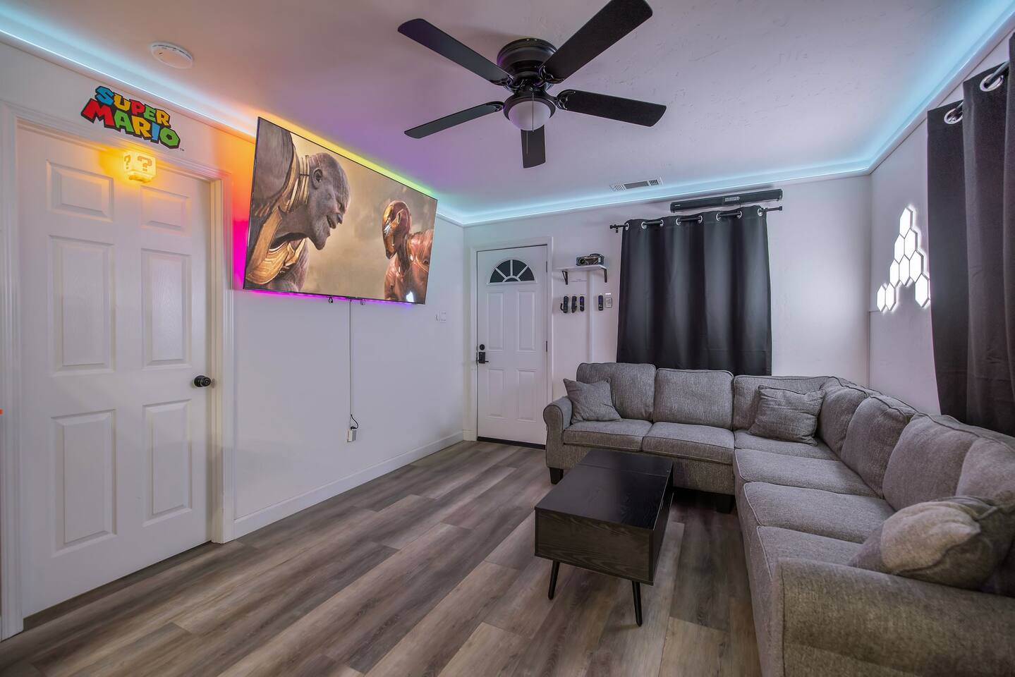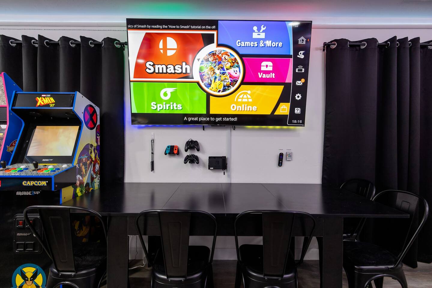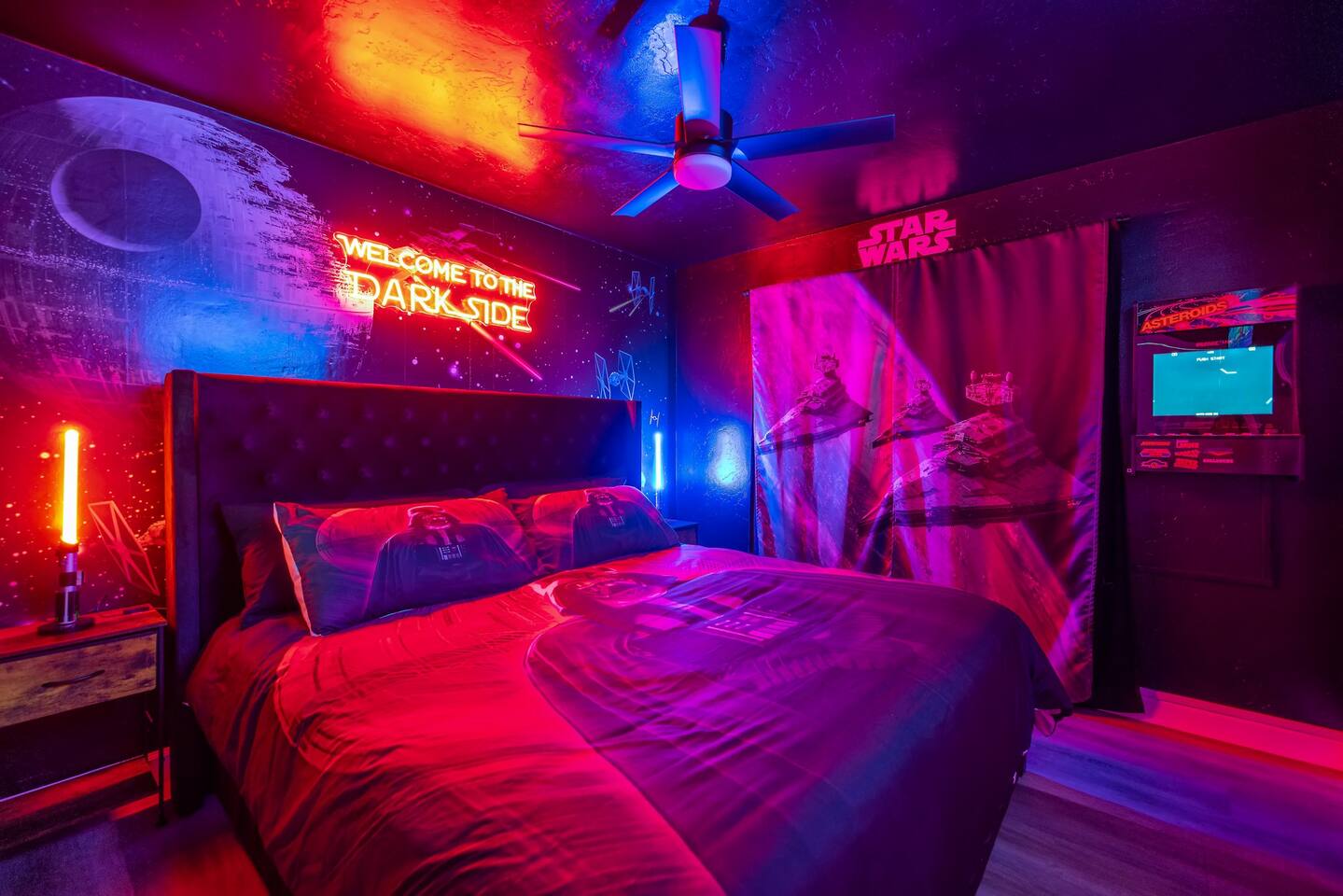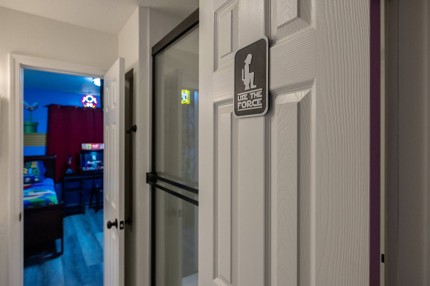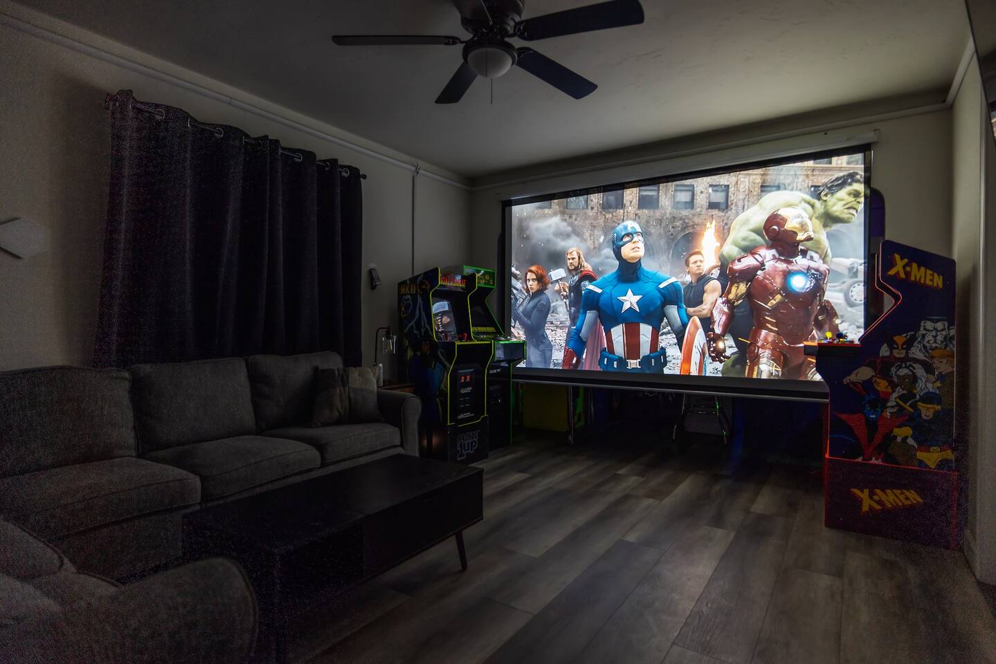 As you enter the front door you are met with a full arcade, a Quad-Screen Jumbotron & customizable color changing lights on every square inch of the living/dining room! The living room features a 75" TV, 6-Seater sectional and a 120" projector w/ pull down screen, turning your living room into a full fledged home theater! The dining room features yet another 75" TV and a Nintendo Switch w/ 4 controllers that is pre-loaded with Super Smash Bros Ultimate & Mario-Cart for endless fun! The modern kitchen is fully stocked with everything you need including pots, pans, spices, coffee, creamer, sugar, etc. The Star Wars Imperial themed master bedroom features an ultra comfortable King size bed, 3 arcade games (Pacman, NBA Jam, Asteroids), themed curtains, a death star mural, Imperial helmets, 50" TV and the unbridled force of the sith. The Super Mario themed kids bedroom features 3 twin size beds, 3 arcade games (Pacman, NBA Jam, NEO GEO), a Super Mario landscape across the entirety of the walls, themed curtains, 50" TV and the whimsical magic of the entire mushroom kingdom. As you enter the backyard you are greeted with a Propane BBQ (propane included), 6-Seater sectional, 50" TV, Cornhole, Giant Jenga, Ladder Toss & Darts to keep your entire party occupied at all times! Through the backyard you will have access to our famous Gaming & Movie Lounge Basement. As you walk down the steps you're met with Han-Solo encased in carbonite and as you enter, you're met with a 65" TV, Nintendo 64, Nintendo NES, a two seater couch and two full size arcade games! Don't pass up this incredible home and treat your group to a once in a lifetime stay at our beautiful gamer's retreat near Sequoia National Park!