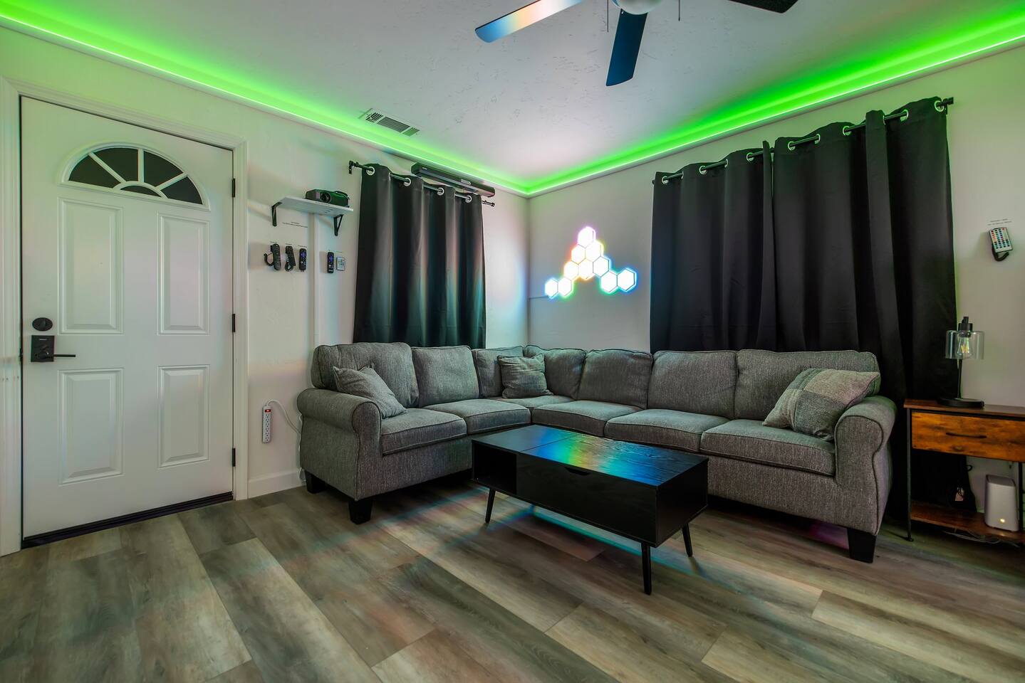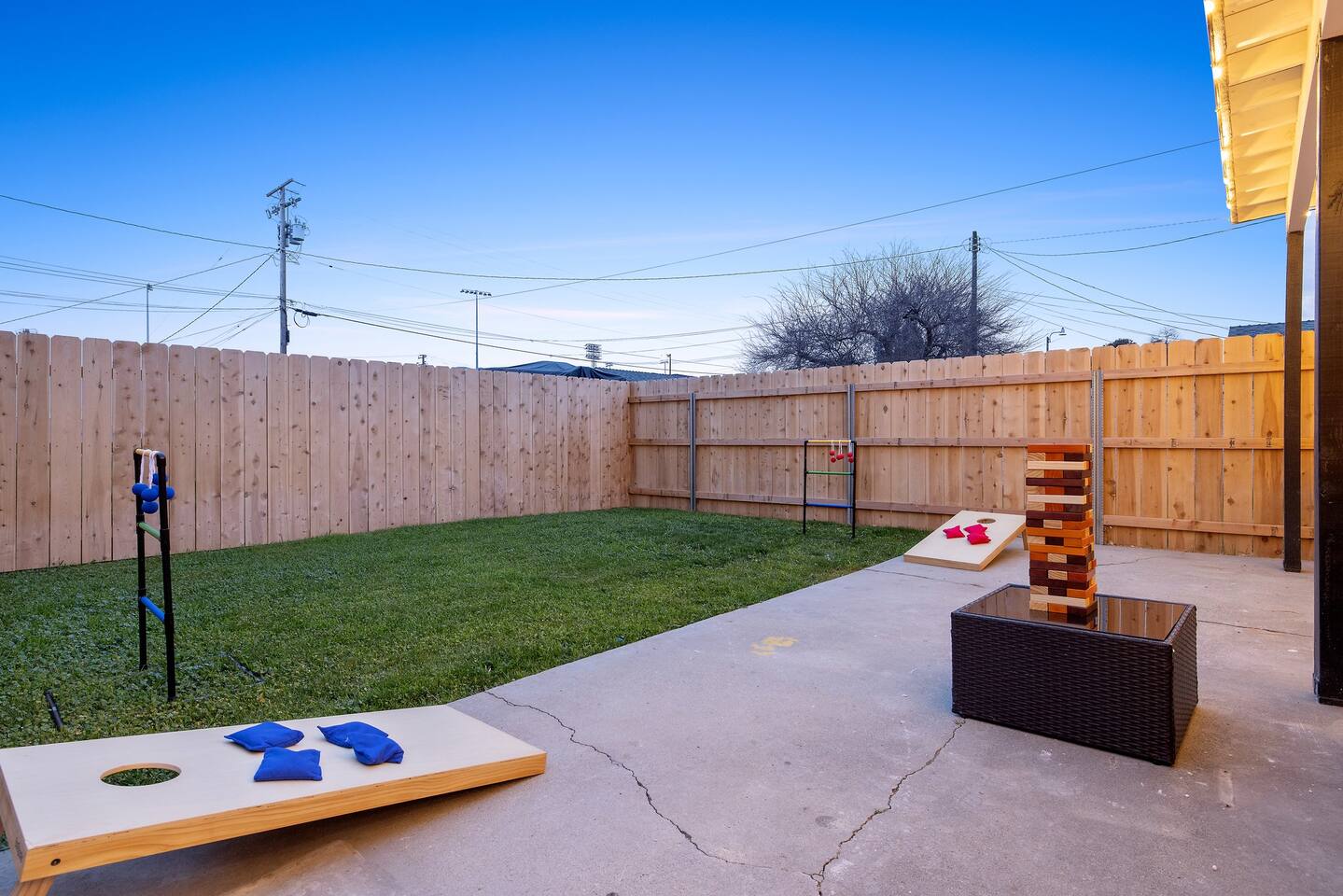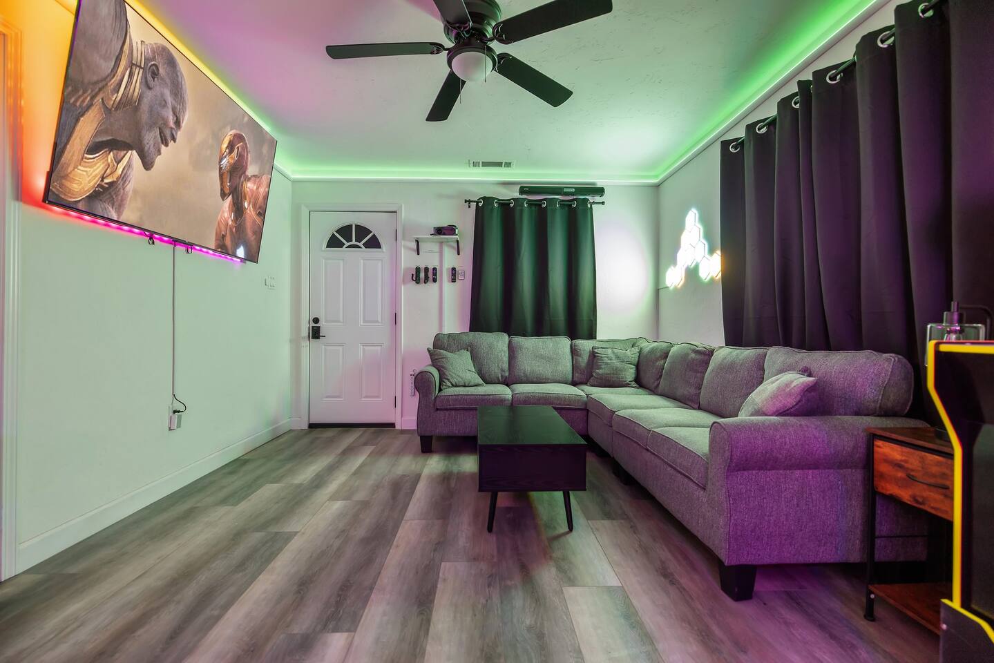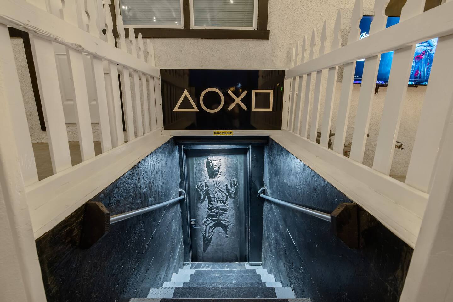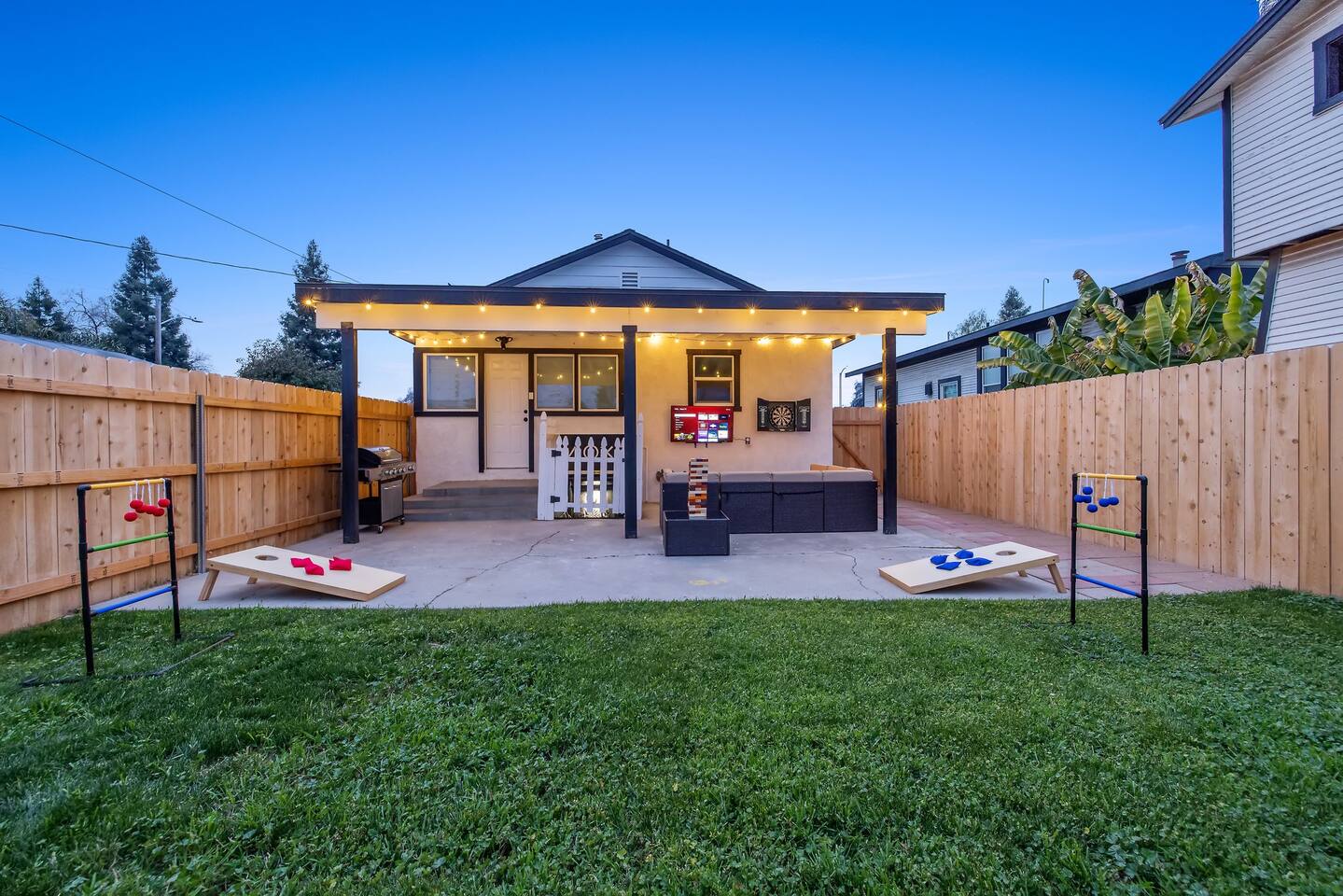 As you enter the front door you are met with a full arcade, a Quad-Screen Jumbotron & customizable color changing lights on every square inch of the living/dining room! The living room features a 75" TV, 6-Seater sectional and a 120" projector w/ pull down screen, turning your living room into a full fledged home theater! The dining room features yet another 75" TV and a Nintendo Switch w/ 4 controllers that is pre-loaded with Super Smash Bros Ultimate & Mario-Cart for endless fun! The modern kitchen is fully stocked with everything you need including pots, pans, spices, coffee, creamer, sugar, etc. The Star Wars Imperial themed master bedroom features an ultra comfortable King size bed, 3 arcade games (Pacman, NBA Jam, Asteroids), themed curtains, a death star mural, Imperial helmets, 50" TV and the unbridled force of the sith. The Super Mario themed kids bedroom features 3 twin size beds, 3 arcade games (Pacman, NBA Jam, NEO GEO), a Super Mario landscape across the entirety of the walls, themed curtains, 50" TV and the whimsical magic of the entire mushroom kingdom. As you enter the backyard you are greeted with a Propane BBQ (propane included), 6-Seater sectional, 50" TV, Cornhole, Giant Jenga, Ladder Toss & Darts to keep your entire party occupied at all times! Through the backyard you will have access to our famous Gaming & Movie Lounge Basement. As you walk down the steps you're met with Han-Solo encased in carbonite and as you enter, you're met with a 65" TV, Nintendo 64, Nintendo NES, a two seater couch and two full size arcade games! Don't pass up this incredible home and treat your group to a once in a lifetime stay at our beautiful gamer's retreat near Sequoia National Park!